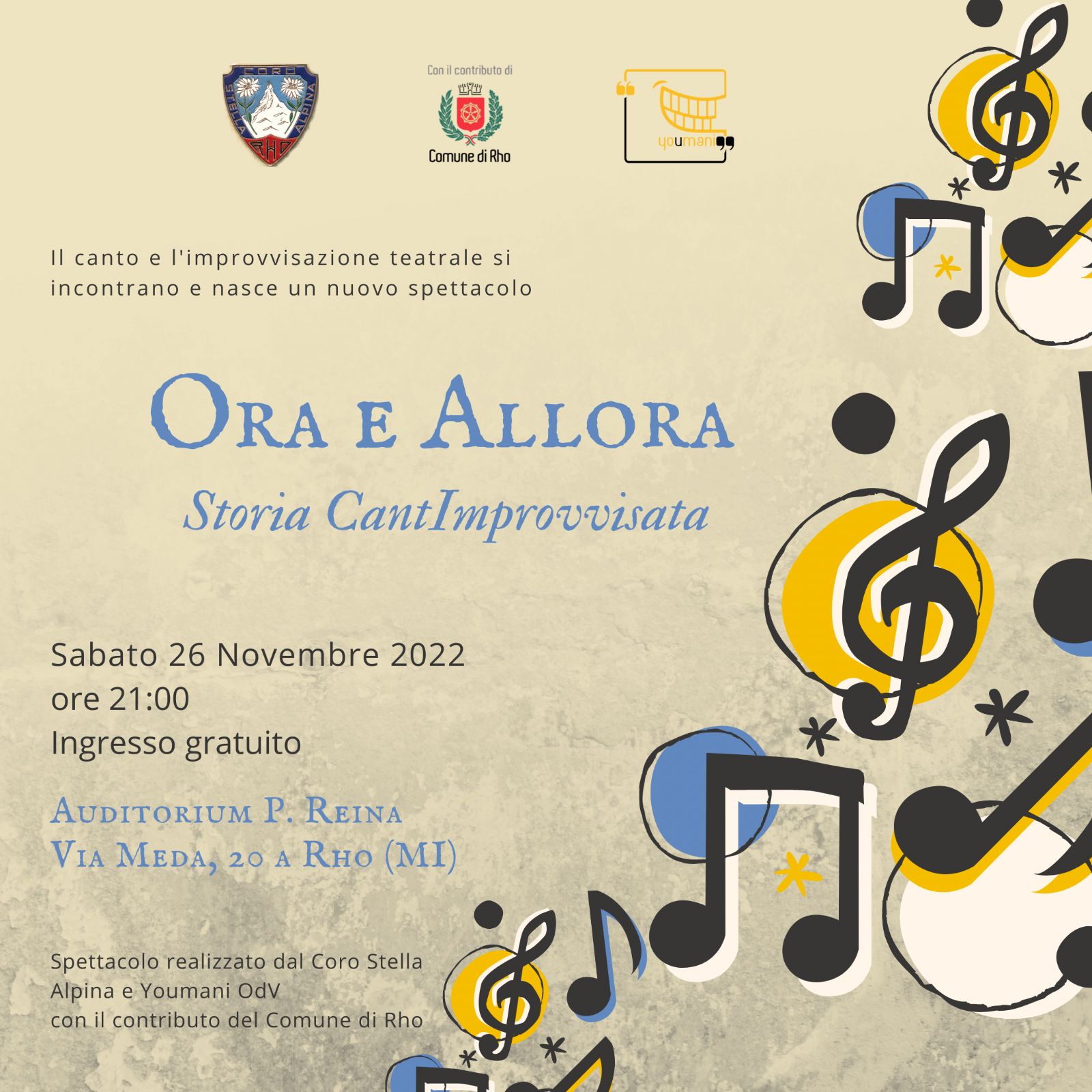 Cosa succede quando si uniscono le energie e si decide di raccontare una storia a tante voci e ognuno a suo modo? Semplice: una magia! Ed è magia quella che si crea tra gli improvvisatori di Youmani OdV e il Coro Stella Alpina. Due realtà con storie e competenze diverse, ma che insieme portano il pubblico a immergersi in una atmosfera emozionante e divertente, dove canzoni e improvvisazione teatrale si alternano e si fondono per raccontare, a modo loro, la storia del canto corale dalle origini, con canti tipici della tradizione di montagna e degli Alpini, proseguendo con gli autori che danno un’impronta diversa e più popolare, con le storie delle varie zone d’Italia, per arrivare alle canzoni tipiche popolari regionali, quelle straniere e i canti di musica leggera.