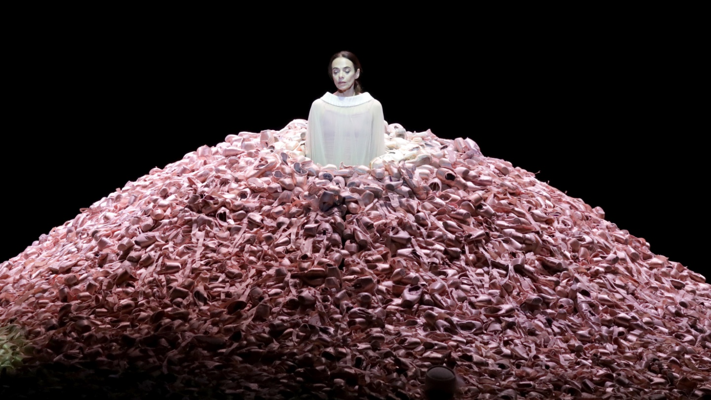 Un'affascinante trasposizione in chiave danzata che propone flash esistenziali, con momenti belli e drammatici galleggianti in una dimensione scandita dal tempo che avanza inesorabile, da lunghi silenzi e dagli oggetti della vita di Winnie, sommersa non più dalla ben nota collina di sabbia ma da una montagna di consunte scarpette da punta.