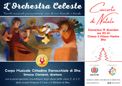 Il Concerto sarà seguito domenica 19 dicembre alle ore 20.45 da "L'Orchestra celeste", a cura del Corpo Musicale Cittadino Parrocchiale in collaborazione con la Scuola Primaria S. Carlo e S. Michele, in uno spettacolo che quest'anno sarà dedicato in modo particolare ai bambini e alle famiglie. “L’Orchestra celeste” è una favola natalizia musicale per narratore, coro di voci bianche e banda, fatta da ragazzi e per ragazzi, tra musica e racconto, in cui si narra la tenera  e divertente storia di Carlotta e degli Angeli dell'Orchestra celeste, che scendono precipitosamente sulla Terra  per annunciare il Natale.