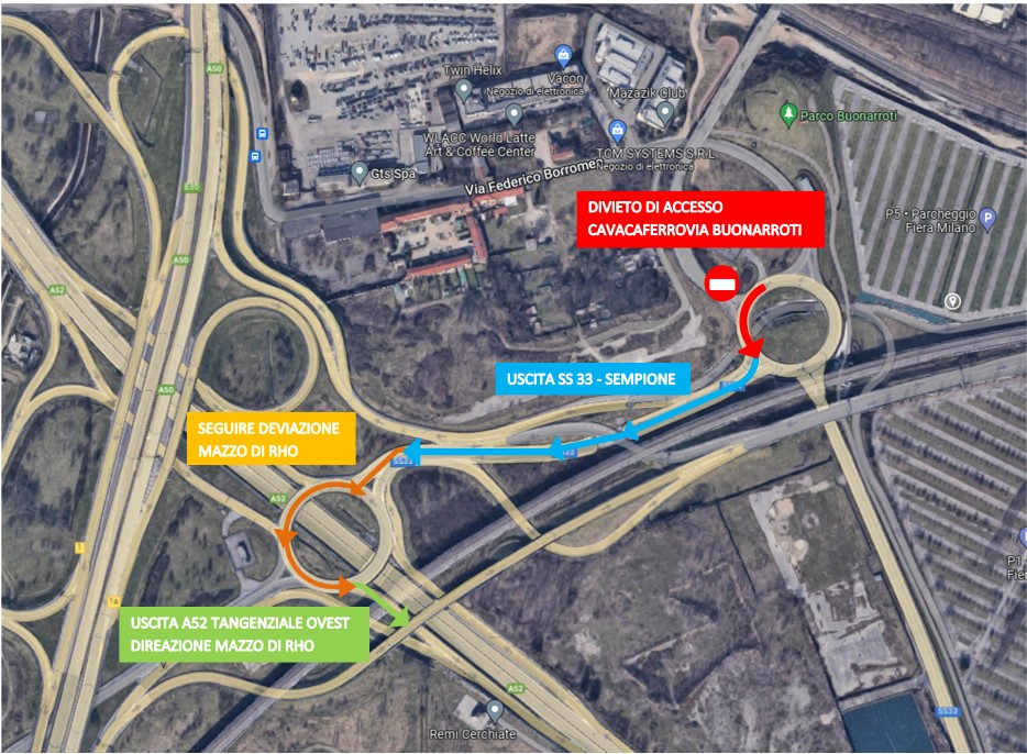 Il ponte sarà aperto con il solo senso unico con direzione Pero durante i mesi estivi per consentire i lavori, realizzati da NED, che prevedono l’istallazione di una nuova conduttura del gas. Il traffico diretto verso Mazzo, Terrazzano e Arese sarà deviato verso la rotatoria R1 di imbocco A52 (tratto interrato della SS33) con uscita Mazzo di Rho verso viale De Gasperi.