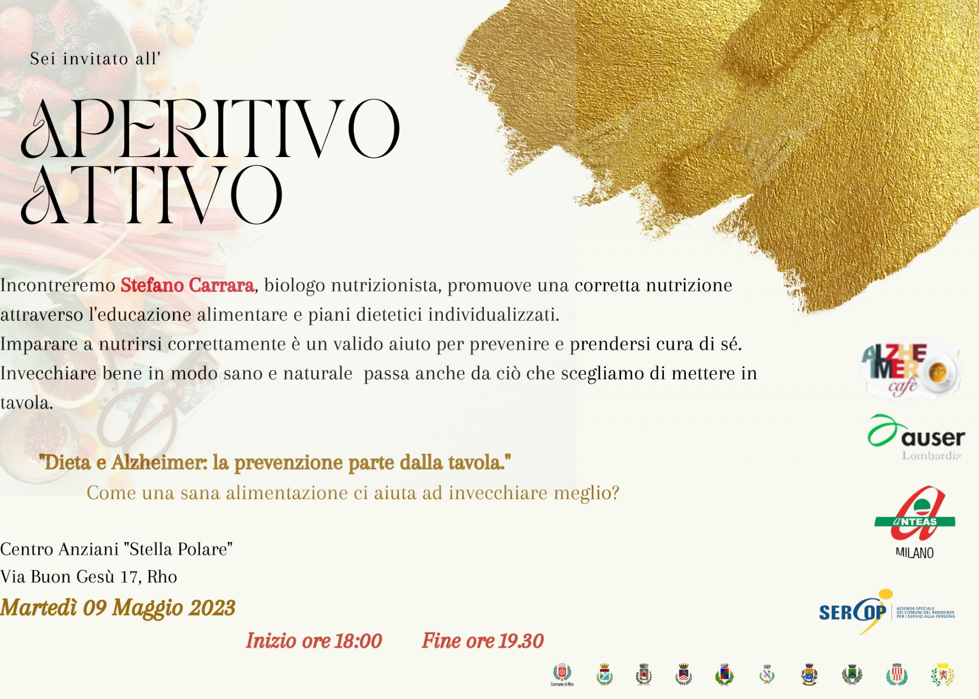 Prossimo appuntamento il 9 maggio dalle 18 con il biologo nutrizionista Stefano Carrara, che parlerà di: "Dieta e Alzheimer: la prevenzione parte dalla tavola" Come una sana alimentazione ci aiuta a invecchiare meglio. Vi aspettiamo