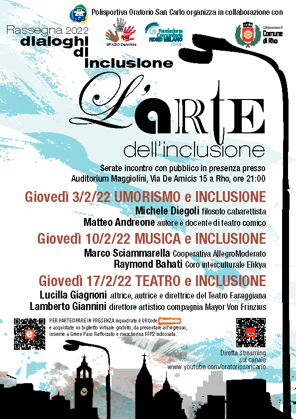 Dopo la buona riuscita delle esperienze passate, la Polisportiva Oratorio San Carlo e l’associazione Spazio De Amicis propongono anche per il 2022 alcuni momenti di ascolto e incontro da proporre alla cittadinanza di Rho, fruibili anche a distanza on line. Questa edizione interpreterà il tema dell’inclusione da una prospettiva artistica, in diversi ambiti: umorismo, musica, teatro. Da qui il titolo della rassegna “L’arte dell’inclusione”.