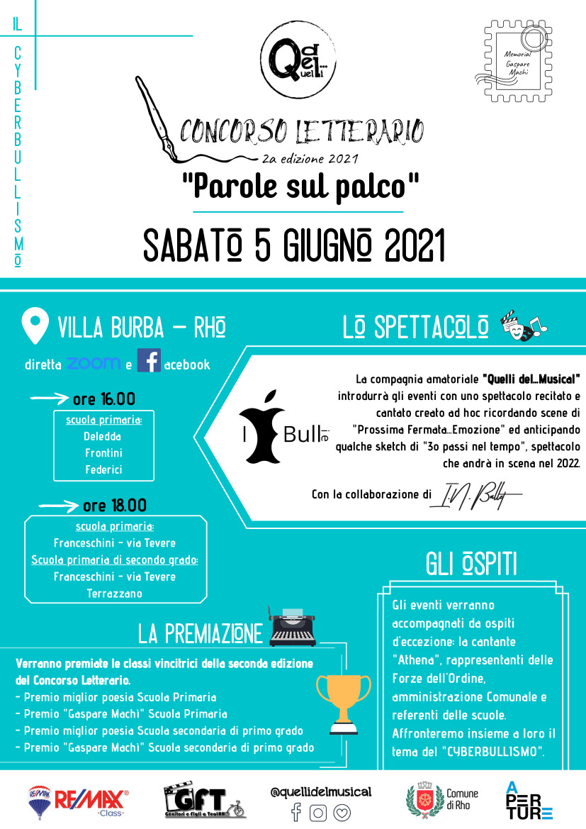 Il 5 giugno alle ore 16 e alle ore 18 in diretta Zoom dal Parco di Villa Burba sarà presentata la Premiazione della 2°edizione del Concorso Letterario Parole sul Palco in memoria di Gaspare Machì promosso dall'Associazione Quelli del....