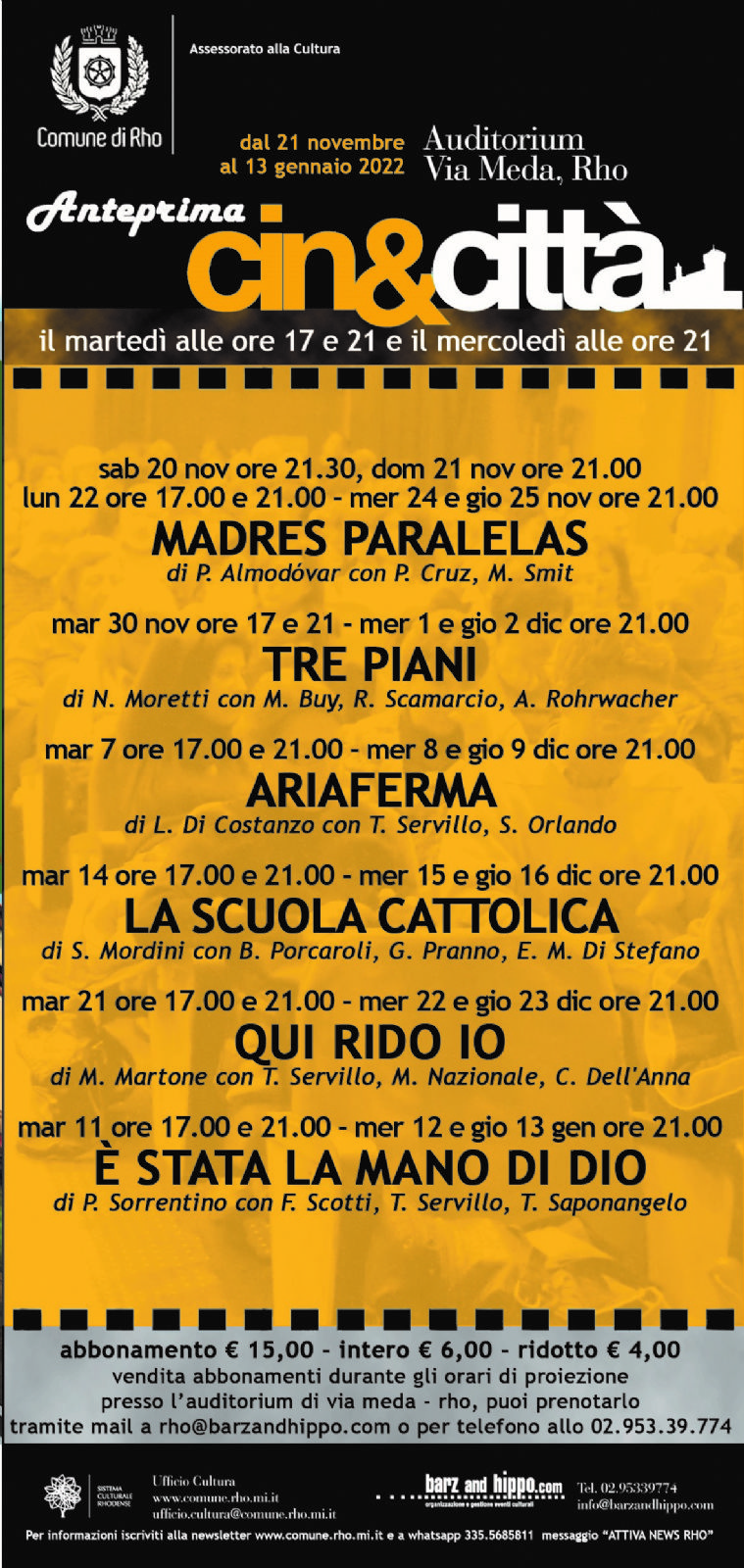 Riprende ANTEPRIMA CIN&CITTÀ: sei film che arrivano fino al 13 gennaio e saranno seguiti poi da una nuova programmazione con CIN&CITTÀ CLASSICA, che inizierà subito dopo, il 18 gennaio. e si parte subito anche con alcuni film nei fine settimana per CIN&CITTÀ RAGAZZI. ci saranno poi anche i film di Natale.