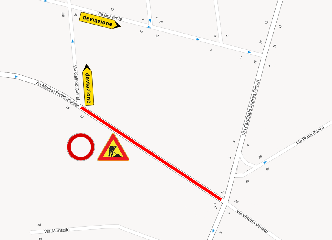 Le persone che vogliono raggiungere via Cardinal Ferrari dovranno transitare in via Galileo Galilei e proseguire su via Bozzente.