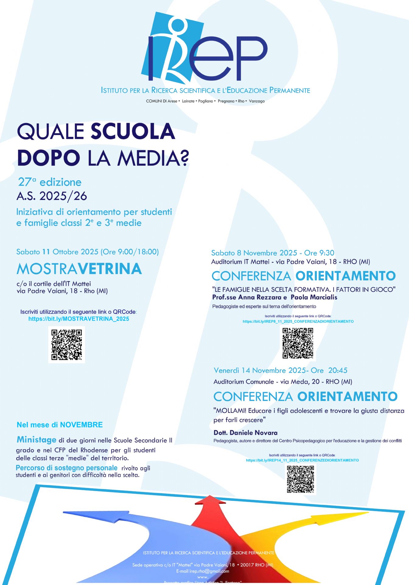 Il Comune di Rho, con l'assessorato alla Scuola coordinato da Paolo Bianchi, sostiene l'iniziativa di IREP, Istituto per la ricerca scientifica e l'educazione permanente, per l'orientamento scolastico per studenti e famiglie delle classi seconde e terze medie.