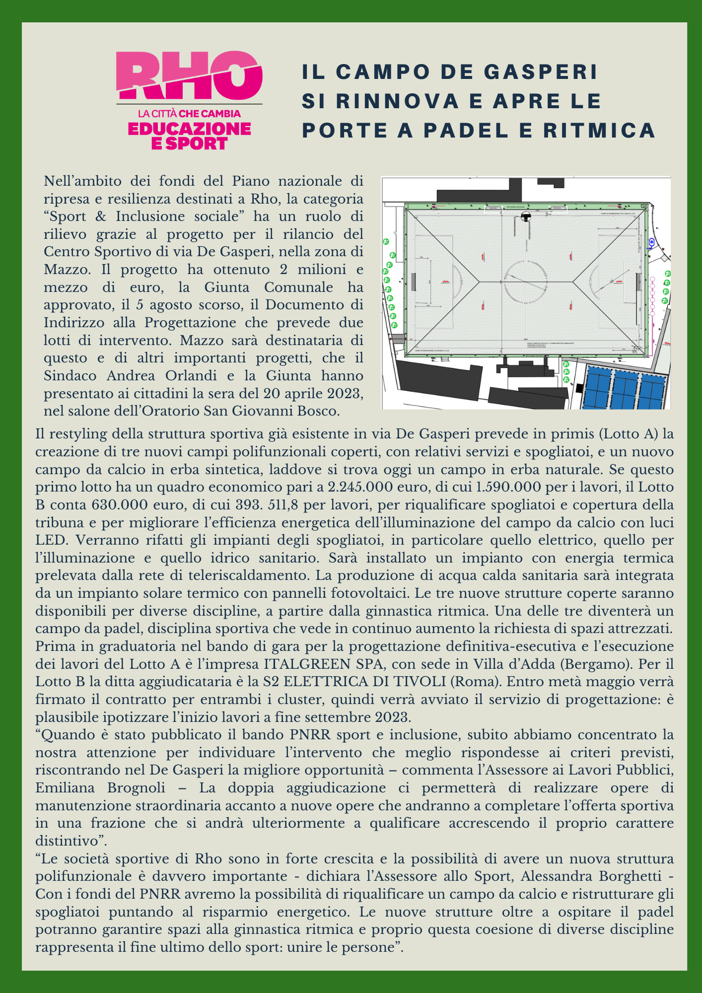 Grazie all’importante finanziamento del PNRR è previsto un vero e proprio restyling della struttura di via De Gasperi, articolato in due lotti: il secondo (Lotto B) prevede la riqualificazione di spogliatoi e copertura della tribuna, oltre al miglioramento dell’efficienza energetica dell’illuminazione del campo da calcio con luci LED.