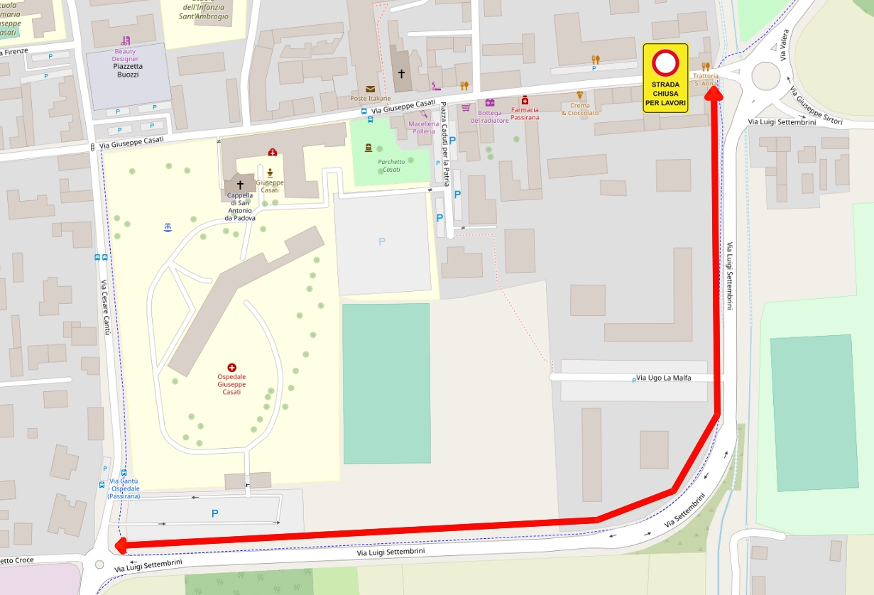 Sabato 2 settembre via Casati a Passirana sarà chiusa per lavori in corrispondenza della rotatoria con via Settembrini. Per entrare e uscire da Passirana sarà quindi necessario transitare su via Cantù, mentre il trasporto pubblico (in rosso nella cartina allegata) sarà deviato su via Settembrini. Sarà consentito il transito pedonale.