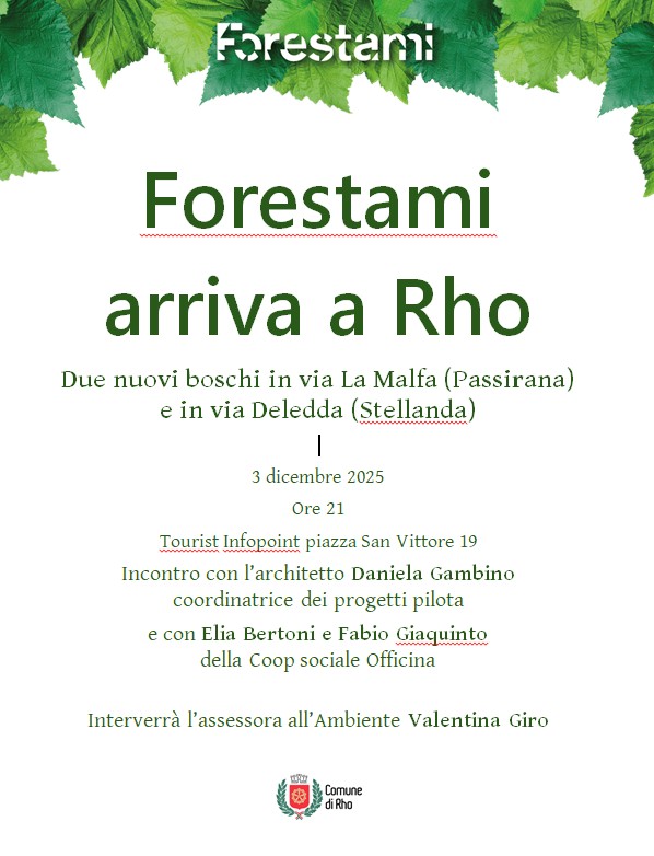 Due nuovi boschi, uno in via La Malfa a Passirana, l’altro in via Deledda nel quartiere Stellanda: è quanto porterà a Rho il progetto Forestami, che dal 2019 coinvolge cittadini, comunità locali, istituzioni, associazioni e aziende con l’obiettivo di mitigare il cambiamento climatico attraverso la piantagione di 3 milioni di nuovi alberi entro il 2030.