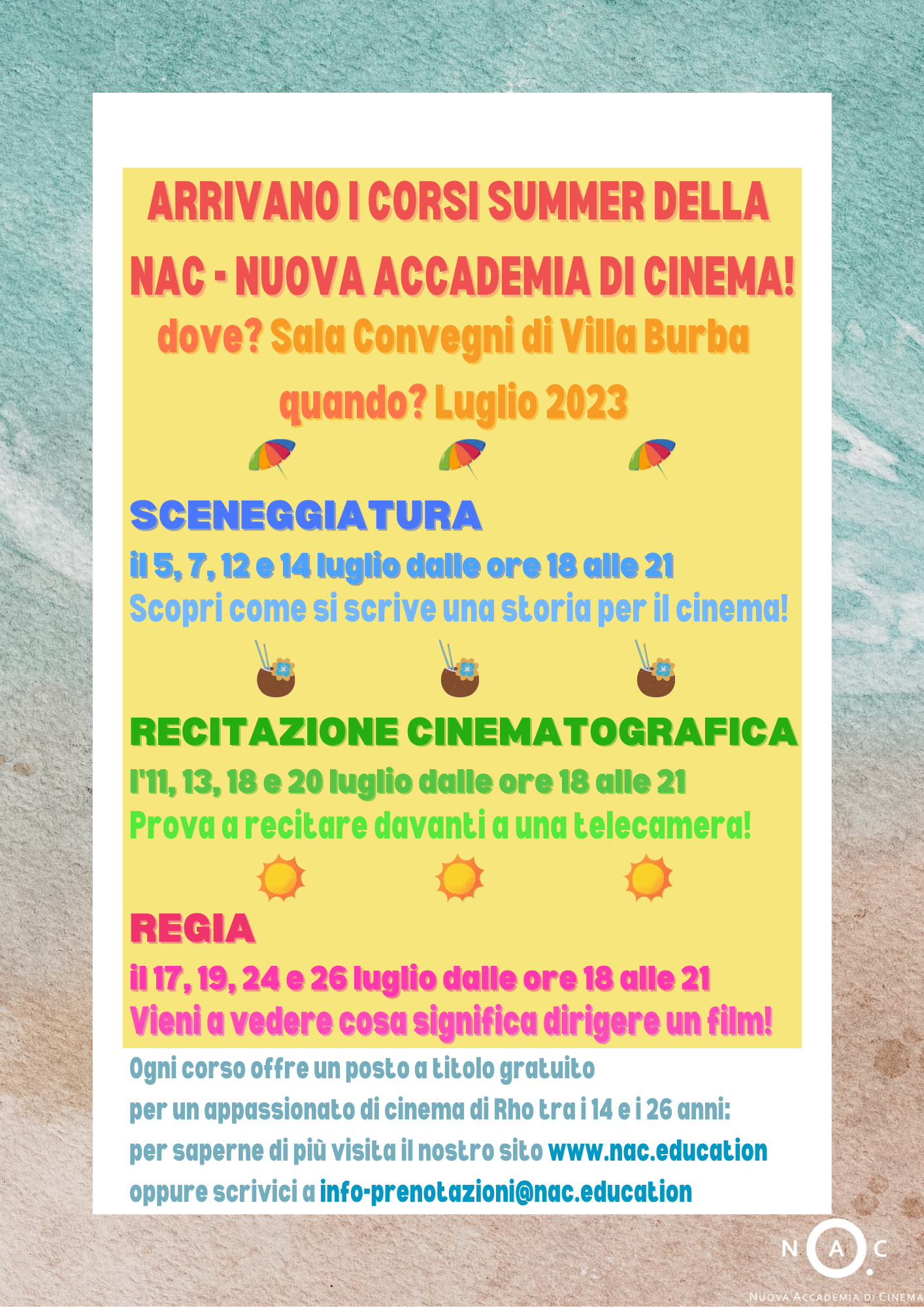 E' iniziato nei giorni scorsi il corso Sceneggiatura Summer, primo dei tre corsi organizzati dal comune di Rho in collaborazione con la NAC, Nuova Accademia di Cinema, in Villa Burba a luglio. Ancora disponibili gli ultimi posti per partecipare per i corsi di regia e recitazione!