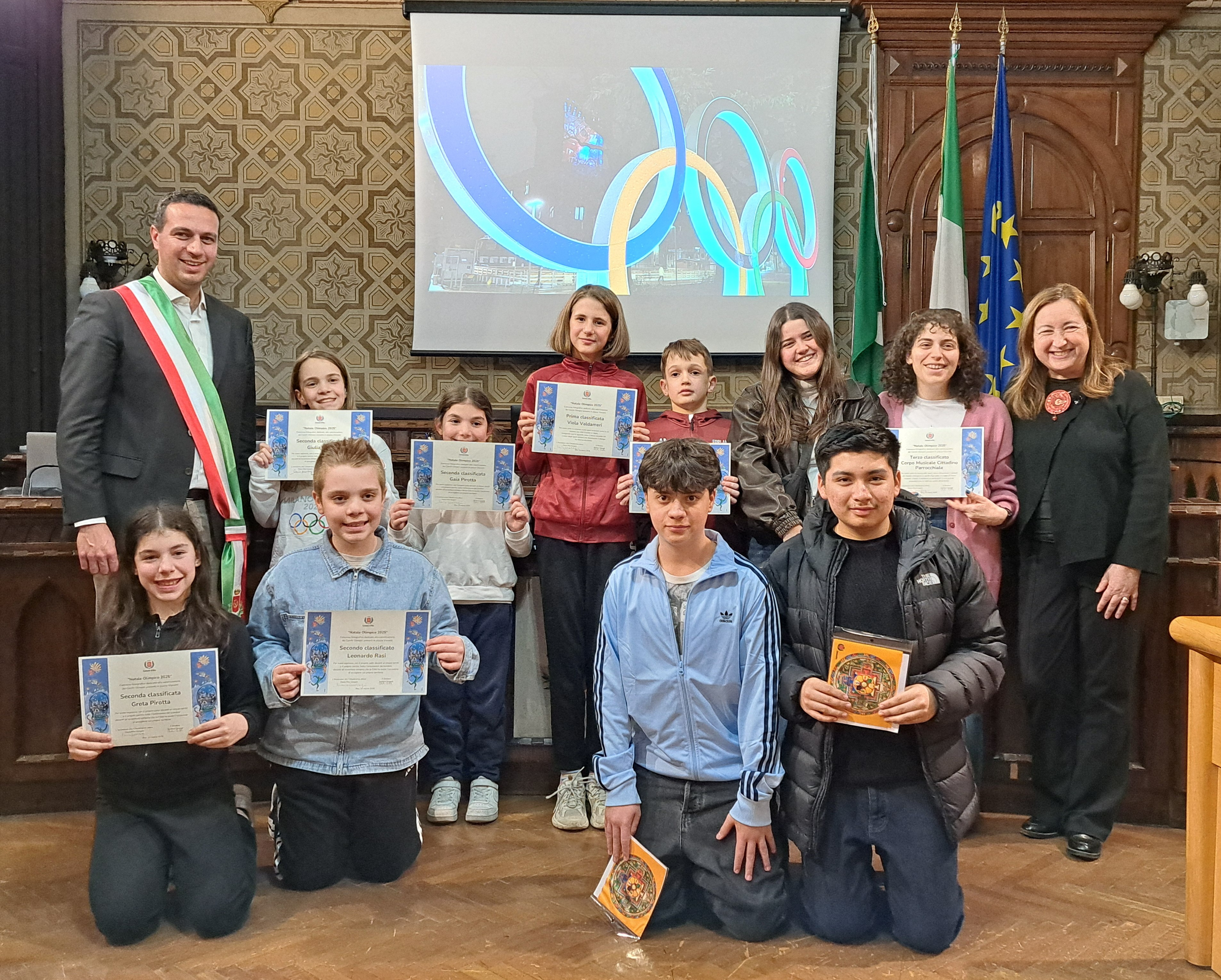 Il sindaco ha chiesto ai bimbi i loro ricordi olimpici: Giulia ha ricordato gli ori visti in Tv, Lorenzo il suo battesimo sul ghiaccio in piazza Visconti, Gaia e Greta le pattinate sulla pista in piazza.