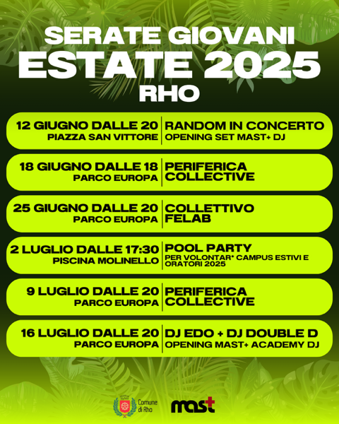 Prende il via il 12 giugno, intersecando il programma della Giovedì Summer Fest, l’estate dei giovani di Rho, organizzata dall’Ufficio Informagiovani con il Mast+ coordinato dalla cooperativa sociale LaFucina e l’assessorato ai Giovani guidato da Paolo Bianchi. Protagonista del primo evento sarà Random, giovane idolo della musica italiana, in concerto dalle ore 20.00 in piazza San Vittore in una serata aperta dai dj di MAST+.