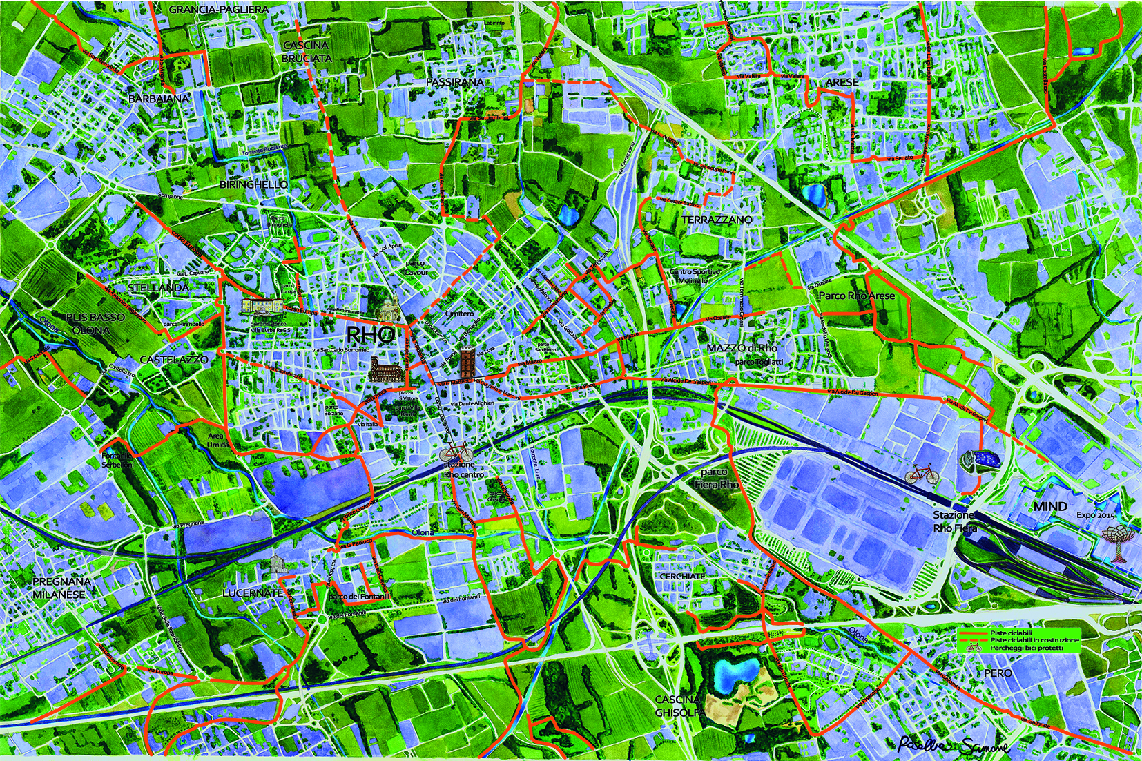 – afferma l’assessore a Piano Strategico, Turismo, Arredo Urbano e Bellezza della Città, Sabina Tavecchia - Nel Piano Strategico si individuano le principali sfide contemporanee della nostra città, tra cui la sostenibilità del vivere lo spazio pubblico all’aperto, l’attrattività di Rho e lo sviluppo della mobilità dolce e delle piste ciclabili. La mappa riveste quindi un’importanza strategica e mostra una città molto verde, dove ci sono vie d’acqua, prati, boschi, campi e numerose piste ciclabili, ma anche luoghi da visitare di interesse artistico e culturale. Per questo motivo è stato deciso di realizzare la mappa con una versione artistica, in linea anche con la recente adesione del nostro giardino di Villa Burba al prestigioso  Regis - Rete dei Giardini Storici. Rho dimostra infatti di essere una città da vivere con un’identità storica sull’asse Nord Ovest di Milano, che con il capoluogo lombardo ha condiviso prima Expo 2015 e ora il più sfidante MIND. Attraverso la splendida realizzazione della mappa da parte di Rosalba Scimone, possiamo avere subito a colpo d’occhio una lettura diversa della nostra città, davvero abbracciata dal verde. La mappa è il risultato corale raggiunto grazie alla collaborazione degli Assessori Valentina Giro e Gianluigi Forloni, l’Ufficio Turismo e gli uffici Verde e Arredo Urbano, Stampa e Comunicazione e Mobilità, e Fiab Rho- Federazione Italiana Ambiente e Bicicletta. Un particolare ringraziamento va all’illustratrice grafica Rosalba Scimone per l’impegno profuso per un prodotto inedito vuol essere il primo tassello su un tema, il verde, più che mai attuale in veloce divenire”.