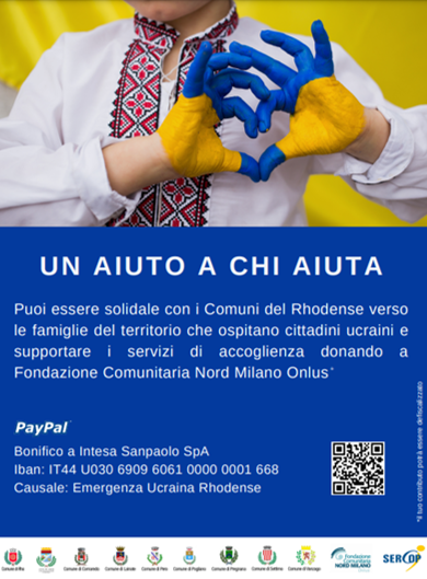 Inoltre puoi essere solidale con i Comuni del Rhodense verso le famiglie del territorio che ospitano cittadini ucraini e supportare i servizi di accoglienza donando a Fondazione Comunitaria Nord Milano Onlus tramite PayPal o bonifico: