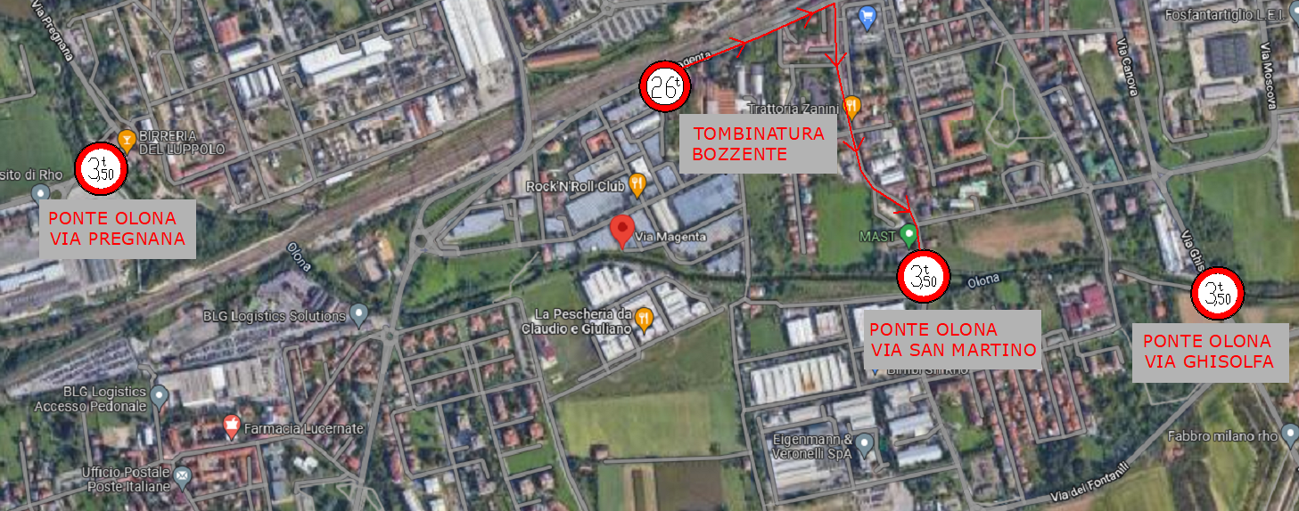 A partire dal 15 febbraio 2023, i carichi massimi ammessi saranno pari a 3.5 tonnellate per i tre ponti sul fiume Olona, con divieto di transito a tutti gli autoveicoli che trasportano merci/cose /persone (autocarri, autotreni, autoarticolati, bus) con massa a pieno carico superiore a 3,5 tonnellate.