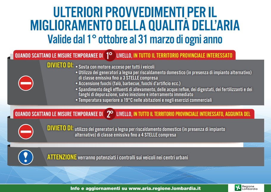 Per maggiori informazioni e aggiornamenti sull’attivazione e la disattivazione delle limitazioni temporanee si rinvia al sito di Regione Lombardia: Info Aria (regione.lombardia.it)