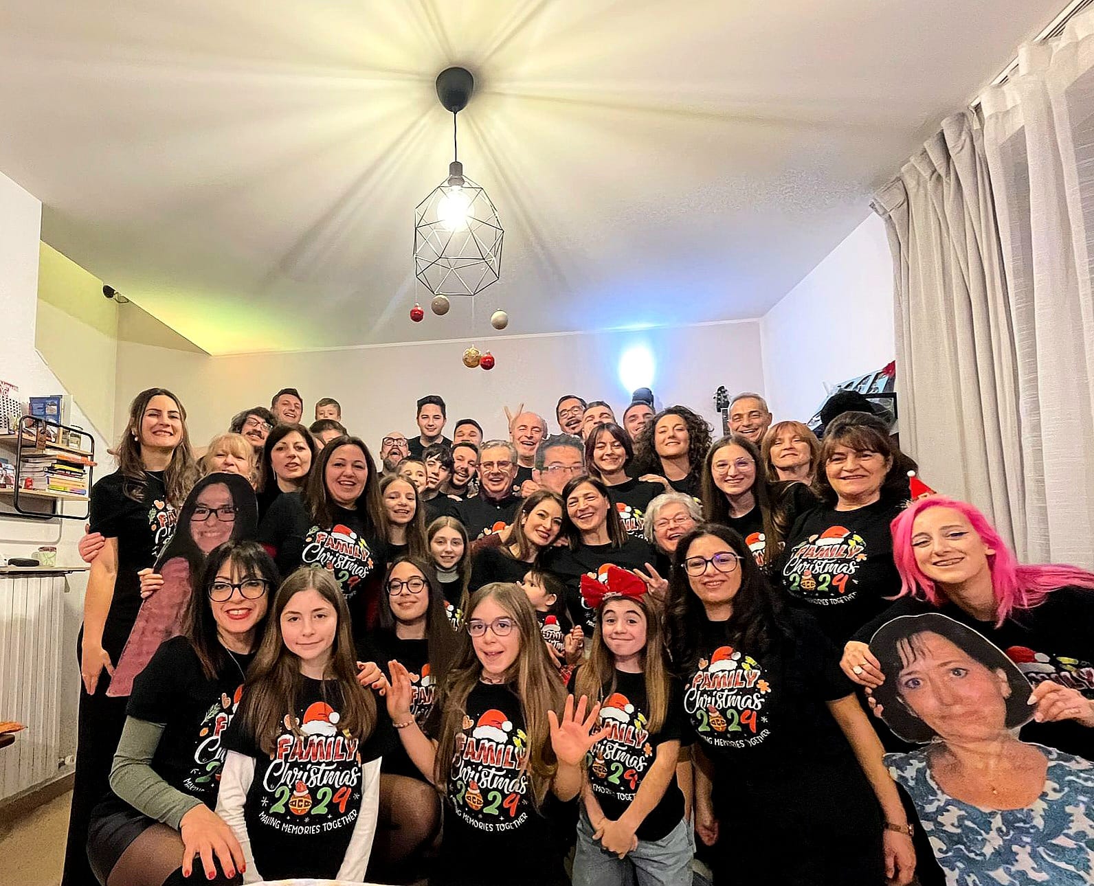 la famiglia Ghiani che, vista la notizia del concorso, si è organizzata stirando su 47 magliette nere stencil colorati ordinati online con la scritta “Christmas family - Making Memories together” (creare ricordi insieme) e nella foto di gruppo ha fatto partecipare anche chi era assente attraverso simpatici cartonati. “Siamo sei fratelli – hanno spiegato le persone presenti – Tutti con le rispettive famiglie ci riuniamo per Natale ogni anno, si cucina, si mangia e ci si diverte insieme fino a tarda sera. L’idea del concorso ci è piaciuta subito e ci siamo attivati per realizzare le magliette”.
