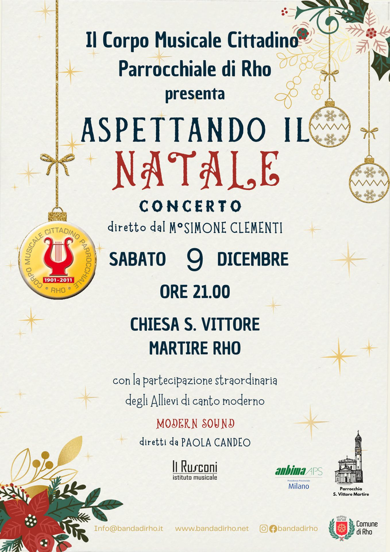 Concerto del Corpo Musicale Parrocchiale Cittadino di Rho diretto dal Mº Simone Clementi con la collaborazione straordinaria degli Allievi di Canto moderno dell'istituto musicale Il Rusconi diretti da Paola Candeo. Sabato 9 dicembre alle ore 21...