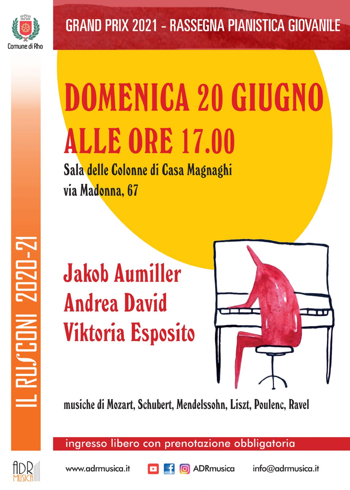 Il Grand Prix 2021 - Italia Musica Giovane si conclude il 20 giugno fra i tasti del prestigioso Steinway della Sala delle Colonne di Casa Magnaghi. La rassegna pianistica giovanile under 20 presenta al grande pubblico tre astri del pianismo nazionale ed europeo, segnalati dalla prestigiosa commissione dei Mm. Carlo Balzaretti, Alessandro Commellato, Andrea Perugini e Gabriele Pinamonti. Sul palco alle ore 17:00 la tredicenne Viktoria Esposito dal Piemonte, il diciottenne milanese Andrea David e il tedesco Jakob Aumiller, ventenne, residente a Trento. I giovani talenti presenteranno in tre brevi recital un programma vario e articolato, che spazia da Mozart a Poulenc e Ravel, attraverso i grandi capolavori della letteratura romantica di Chopin, Schubert, Mendelssohn, Liszt. Grand Prix 2021 è una produzione ADRmusica info@adrmusica.it