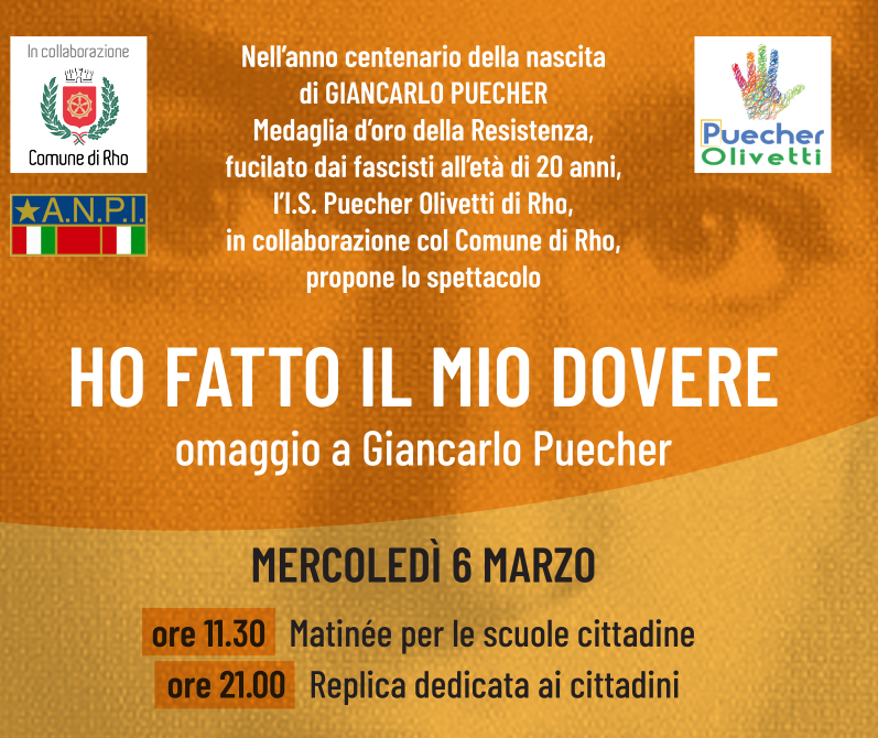 Nell’anno centenario della nascita di Giancarlo Pucher, Medaglia d’oro della Resistenza, fucilato dai fascisti all’età di 20 anni, l’I.S. Puecher Olivetti di Rho, in collaborazione col Comune di Rho, propone lo spettacolo  " Ho fatto il mio dovere" omaggio a Giancarlo Puecher.