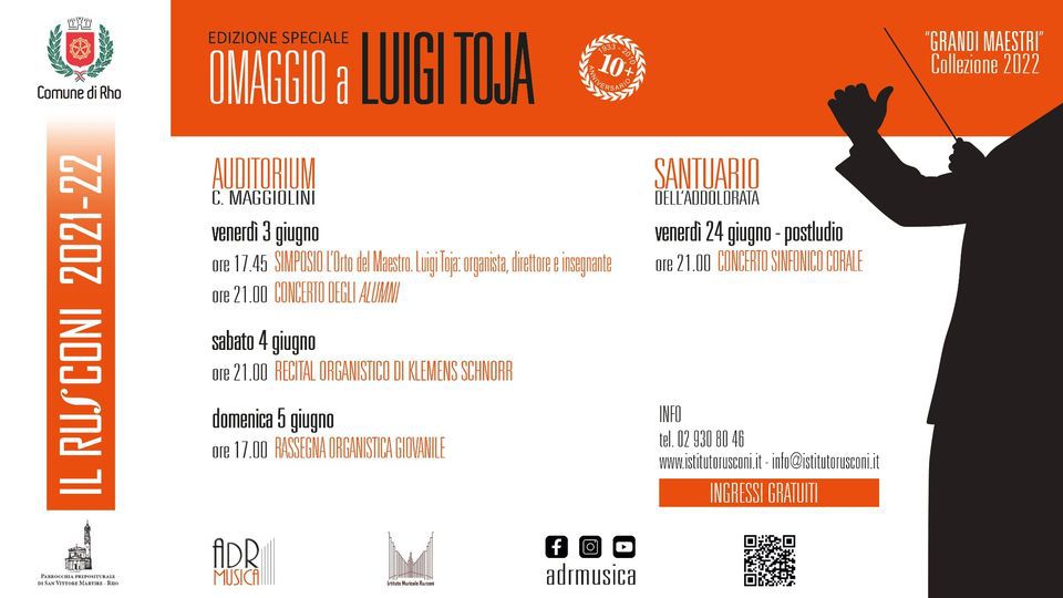 Edizione speciale "Omaggio a Luigi Toja" nel 10+ anniversario della scomparsa! Auditorium Maggiolini via De Amicis 15 Nel pomeriggio di venerdì 3 giugno "SIMPOSIO L'Orto del Maestro. Luigi Toja: organista, direttore, insegnante". Il Convegno...