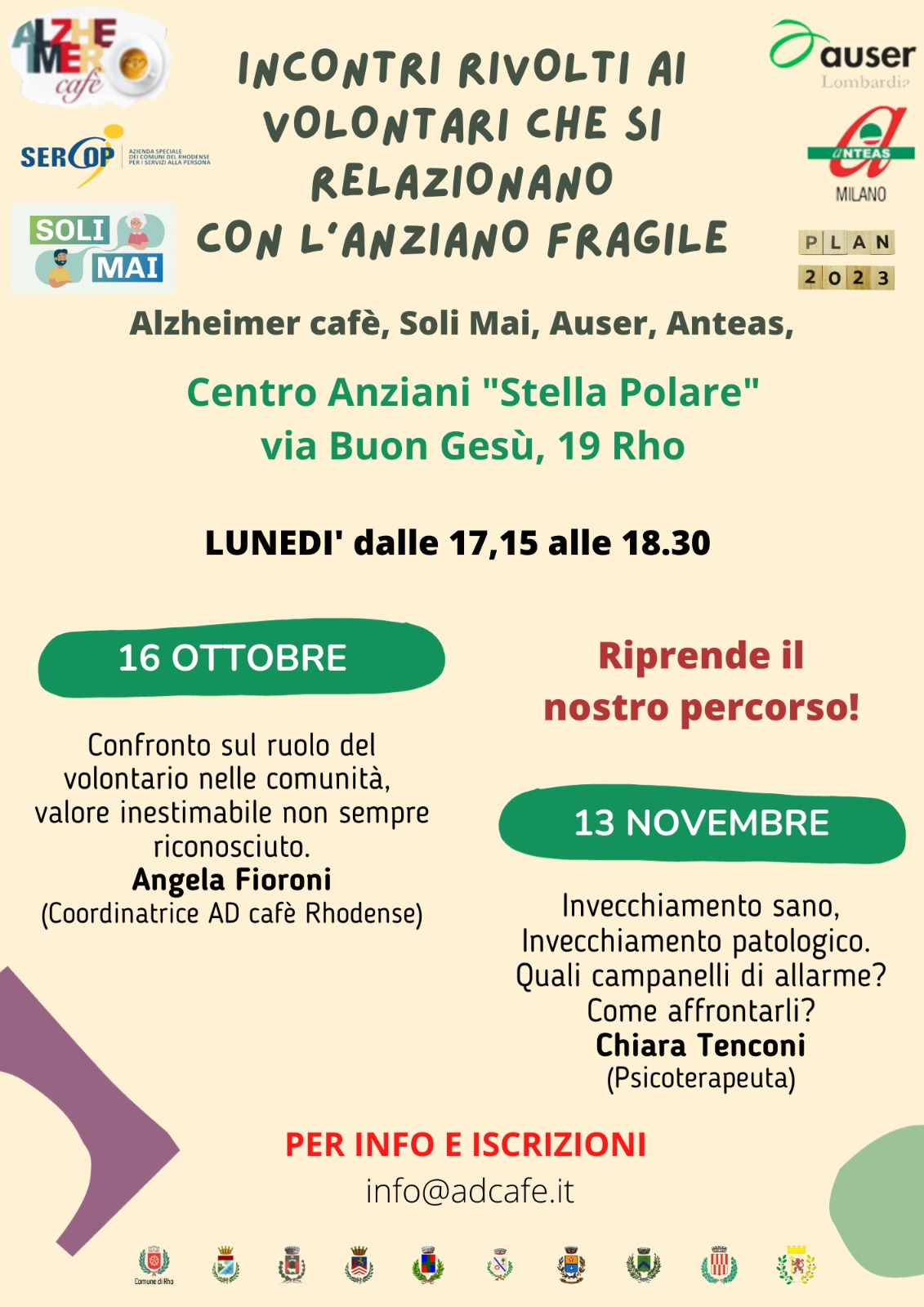 Alzheimer cafè, Soli Mai, Auser, Anteas Centro Anziani "Stella Polare" via Buon Gesù, 19 Rho Lunedì dalle 17.15 alle 18.30 13 novembre Invecchiamo sano. Invecchiamento patologico. Quali campanelli di allarme? Come affrontarli? Chiara Tenconi...
