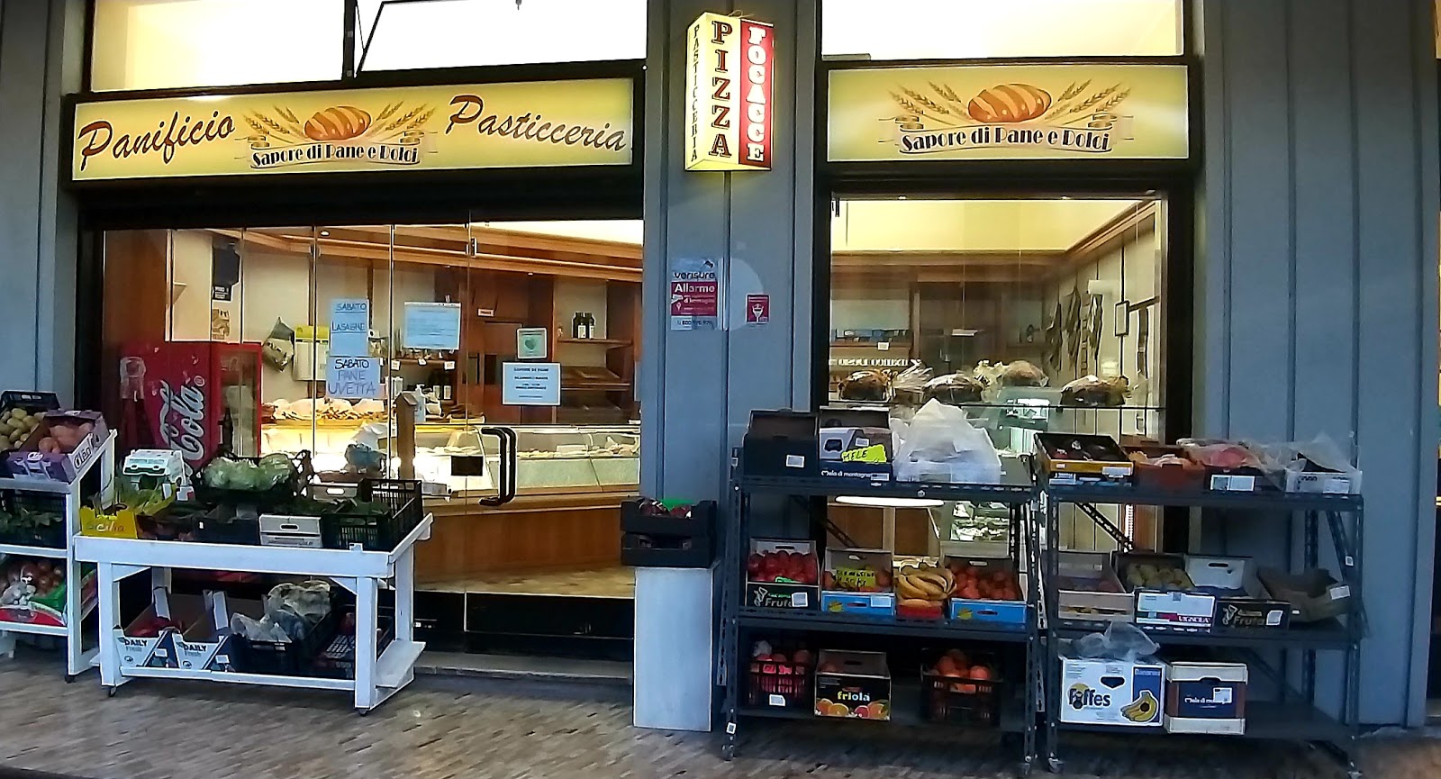 Pane fresco, pizze, focacce, torte, pasticcini freschi, biscotti e altri prodotti di genere alimentare come pasta, latte, uova, zucchero.