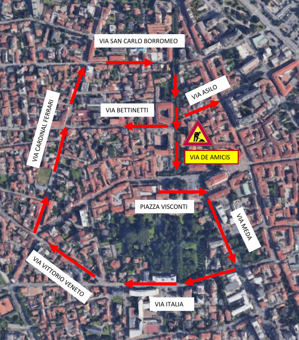 Viene quindi istituita una deviazione per le auto, che possono percorrere, da piazza Visconti, via Meda, via Italia, via Vittorio Veneto, via Cardinal Ferrari e via San Carlo Borromeo per tornare in via De Amicis.