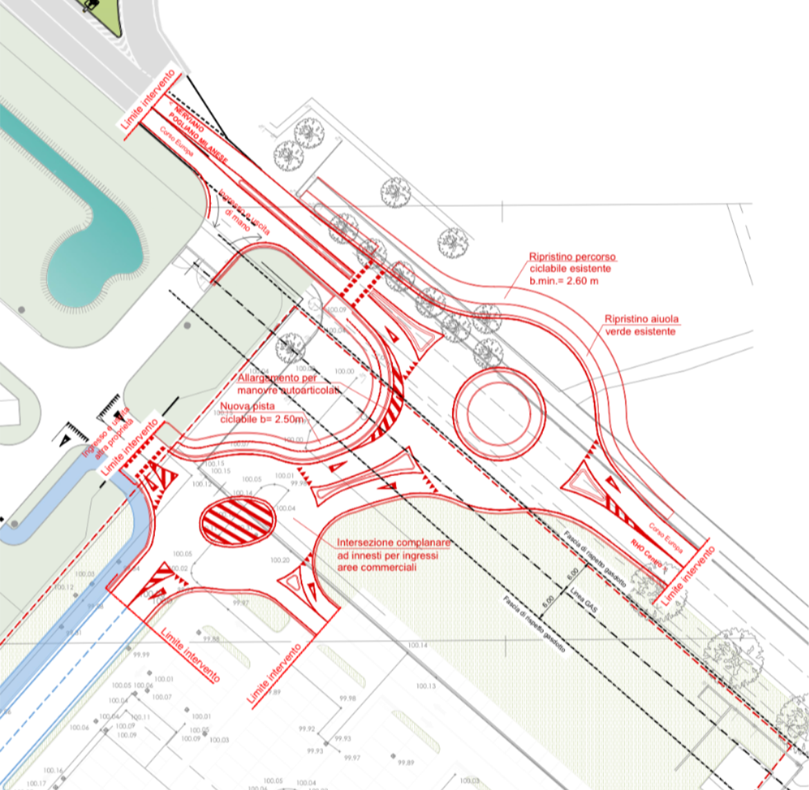 A lato della nuova rotatoria verranno ripristinati il percorso della pista ciclabile, così come l’aiuola e il filare di piante oggi esistenti.