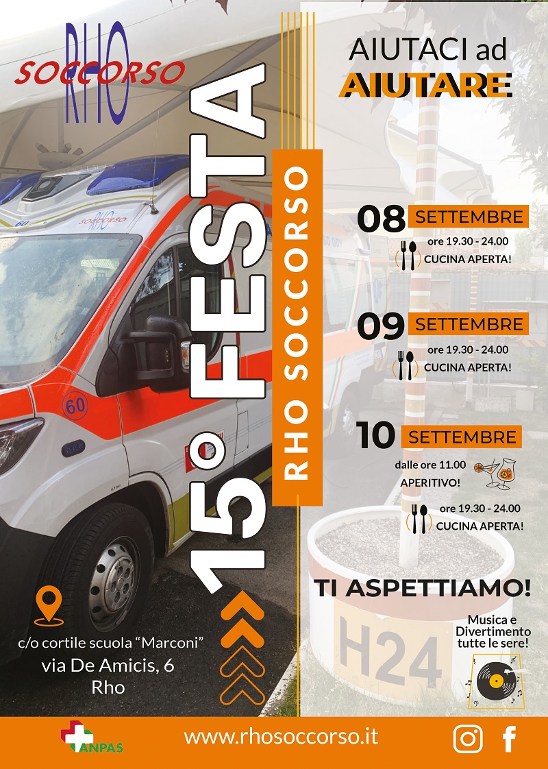 L’Associazione di pubblica assistenza Rho Soccorso vivrà la propria festa annuale da venerdì 8 settembre a domenica 10 settembre nell’area di via De Amicis 2 alle spalle del municipio. La quindicesima edizione della “Festa di Rho Soccorso” ha come slogan “Aiutaci ad aiutare“: non sarà una occasione per promuovere corsi di formazione dei volontari del soccorso, ma una vera festa che permetterà in ogni caso di raccontare alla città il valore dell’impegno quotidiano di tanti volontari.