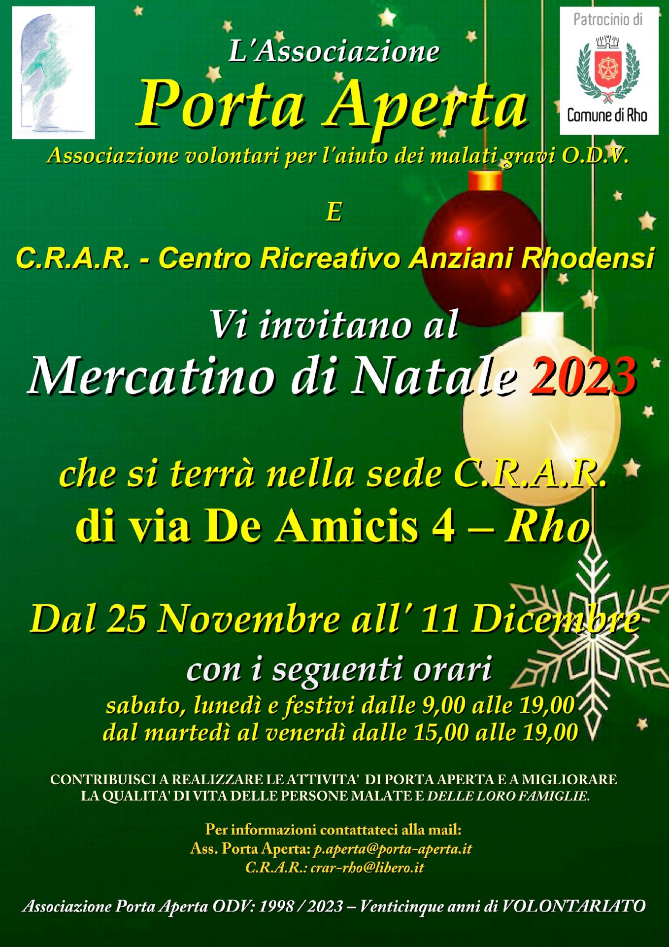 Vi aspettiamo! Il mercatino aprirà sabato 25 novembre e resterà a vostra disposizione fino all'11 dicembre nella sede CRAR, via Edmondo De Amicis, 4 Rho, coi seguenti orari sabato - lunedì - festivi dalle 9.00 alle 19.00 martedì - mercoledì - giovedì e venerdì dalle 15.00 alle 19.00.
