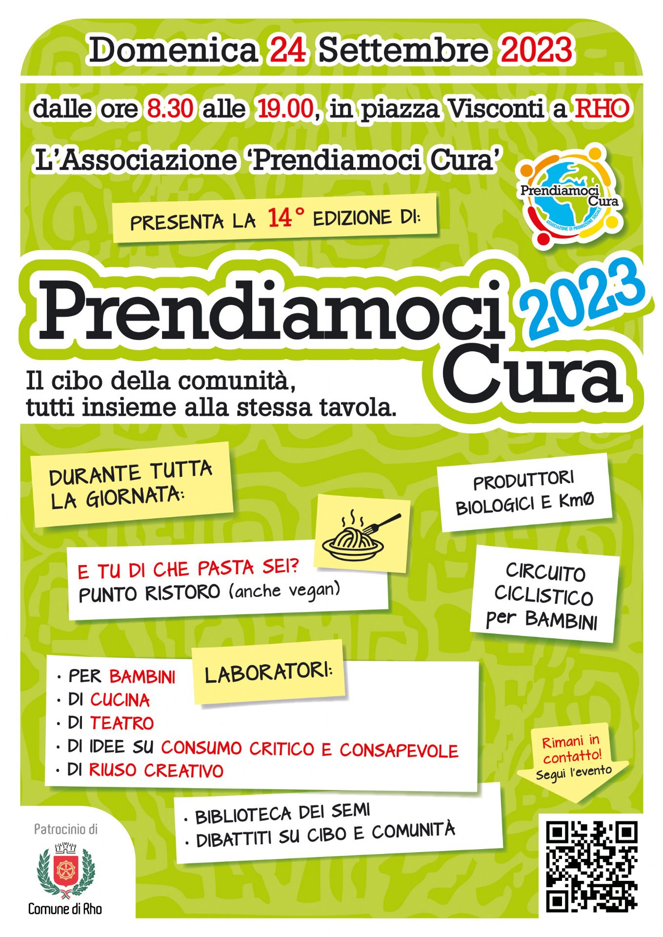 Domenica 24 settembre dalle 8.30 alle 19, l'associazione Prendiamoci Cura presenta la 14esima di Prendiamoci cura, il cibo della comunità tutti insieme alla stessa tavola. Durante tutta la giornata: E tu di che pasta sei? Punto ristoro (anche vegan); produttori biologici e chilometri zero; circuito ciclistico per bambini; laboratori per bambini, di cucina, di teatro, di idee su consumo critico e consapevole, di riuso creativo; biblioteca dei semi e comunità.