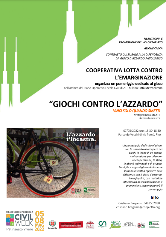 Sabato 7 maggio, 15,30/19,00, Chiosco di Pomè, Parco Pomè , Rho. All'interno dell'Evento Civil Week si propone un pomeriggio di gioco, rivolto ai bambini della città che, anche accompagnati da due educatori scopriranno i giochi in legno di un tempo per allenare la cooperazione, la sfida, le abilità individuali e di gruppo. Le famiglie saranno invitate a riflettere sulle differenze con il gioco d’azzardo. Un infopoint, con materiale informativo di sensibilizzazione e prevenzione sui rischi legati al gioco d'azzardo accompagnerà il pomeriggio.