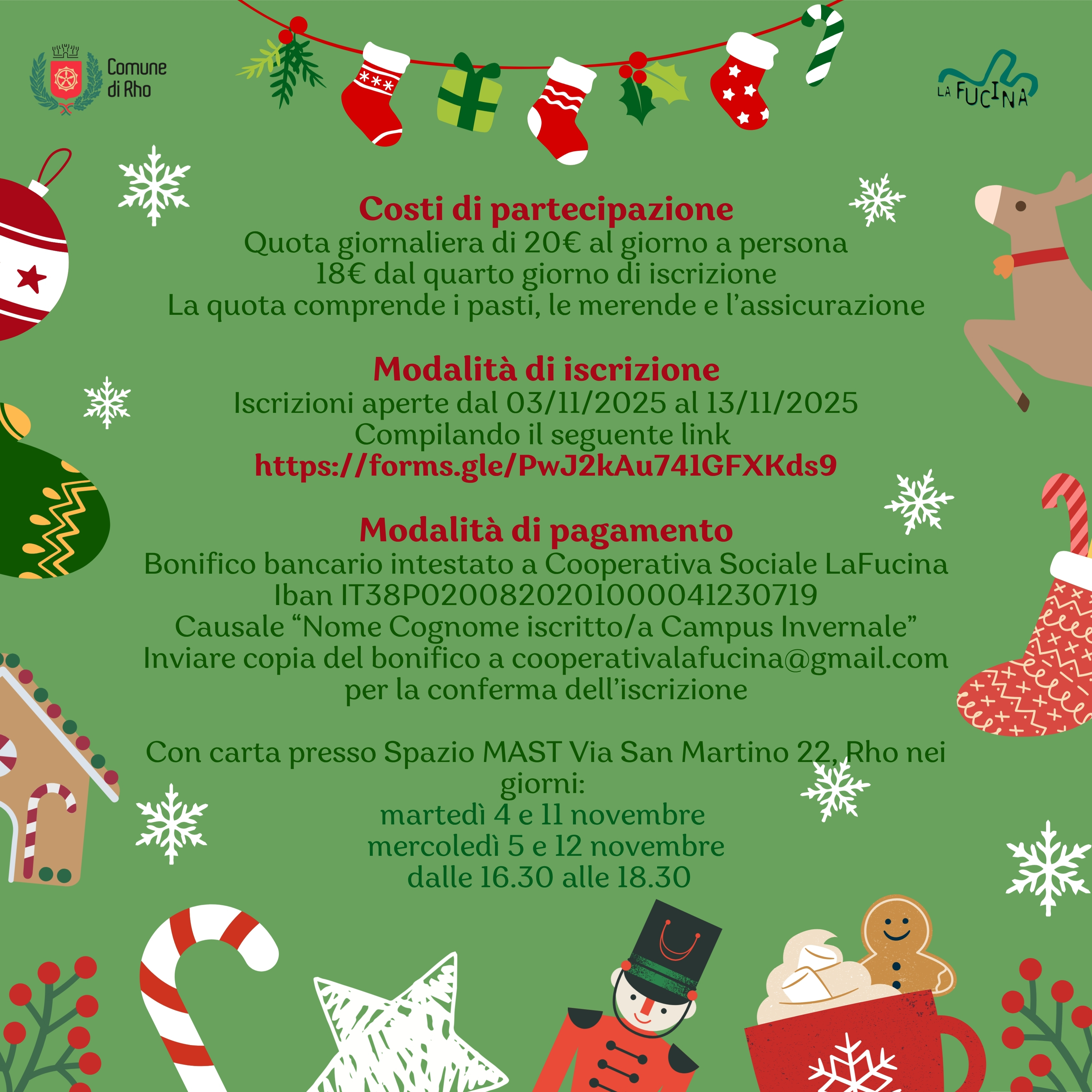 Nelle giornate di chiusura delle scuole per le festività natalizie, l'Assessorato Scuola del Comune di Rho, in collaborazione con la Cooperativa LaFucina, propone il Campus Invernale 2025/2026, dedicato ai bambini di Rho dai 3 ai 10 anni e ai loro genitori.