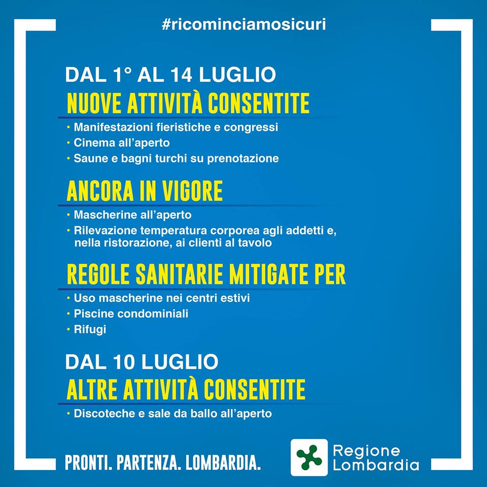 Il 29 giugno il presidente Attilio Fontana ha firmato l’Ordinanza n. 573, che integra le misure approvate dal DPCM dell’ 11 giugno 2020. Le disposizioni dell’Ordinanza n. 573 di Regione Lombardia sono valide da mercoledì 1° luglio fino a martedì 14 luglio 2020 compreso, salvo dove diversamente indicato.