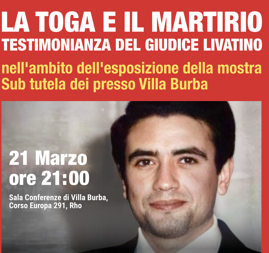 Testimonianza del giudice Livatino nell'ambito dell'esposizione della mostra Sub tutela dei Villa Burba Sala Conferenze  Corso Europa 291 ore 21 Relatori  Avvocato Carlo Tremolada  presidente Libera Associazione Forense Avvocato...
